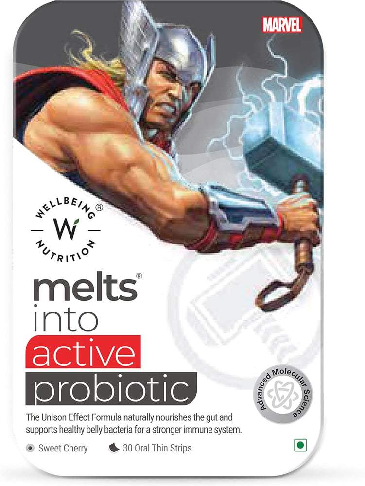 Marvel Thor Melts are oral strips for kids, in a sweet cherry flavour. Each pack includes 30 strips made to support gut health, digestion, and immunity in a fun, easy-to-use format.