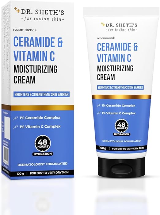 Dr. Sheth’s Ceramide & Vitamin C Moisturizing Cream is a deeply nourishing and barrier-strengthening moisturizer powered by the CVC Complex (Ceramide + Vitamin C + Vitamin E). Specially formulated for dry, dull, and sensitive Indian skin, this dermatologist-developed cream provides intense hydration, antioxidant protection, and skin-brightening benefits — all in a rich, non-greasy texture. It repairs damaged skin, restores elasticity, and enhances natural glow while protecting against environmental stress and pollution.